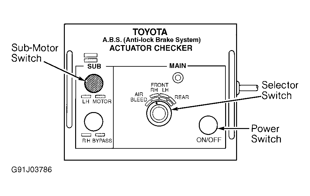 - Press MOTOR button for a few seconds then release it. Depress brake pedal and hold it down for 15 seconds. With brake pedal depressed, press MOTOR button for a few seconds. Ensure brake pedal does not pulsate. If actuator does not test as specified, replace actuator. See ABS ACTUATOR under REMOVAL & INSTALLATION .NOTE: When inspecting REAR LH position, push REAR LH POWER SWITCH button instead of POWER SWITCH button.