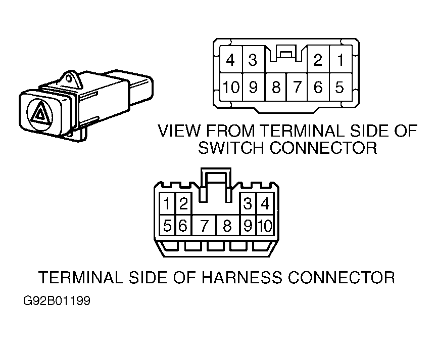 Remove hazard warning switch. With switch in OFF position, there should be continuity between terminals No. 7 and 10. See Fig 1. With switch in ON position, there should be continuity between terminals No. 7 and 8, and between terminals No. 5, 6 and 9. With switch in either position, there should be continuity between terminals No. 2 and 3 (illumination light). If continuity is not as specified, replace switch.
