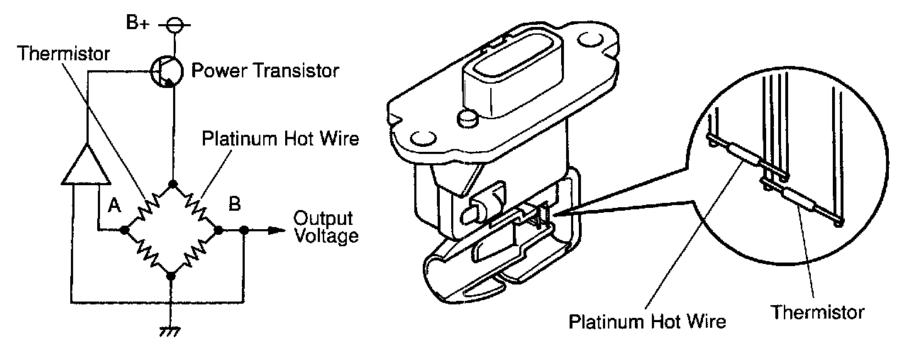 The mass air flow meter uses a platinum hot wire. The hot wire air flow meter consists of a platinum hot wire, thermistor and a control circuit installed in a plastic housing.