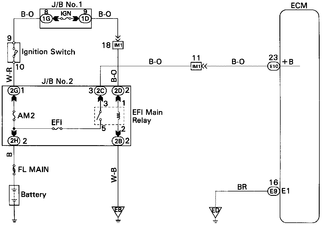 When the ignition switch is turned ON, battery positive voltage is applied to the coil, closing the contacts of the EFI main relay and supplying power to the terminal +B of the ECM.