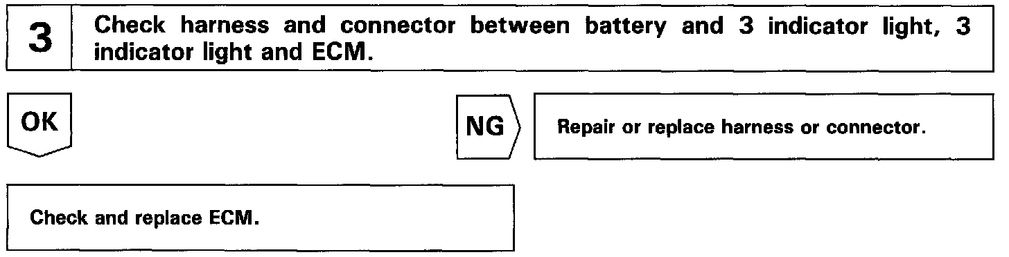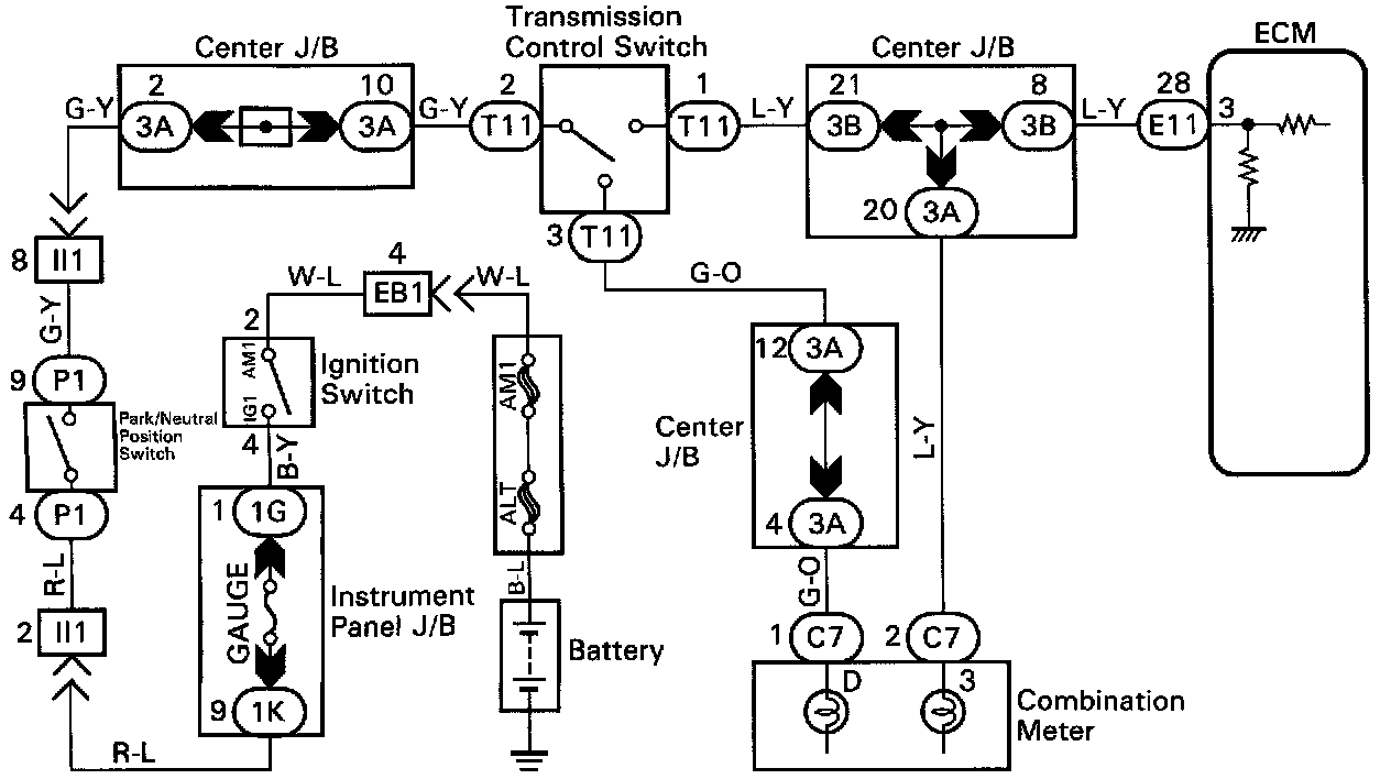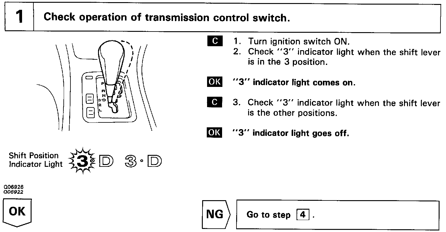 When the shift lever is in the 3 position (with transmission control switch is pressed), "3" in the shift position indicator light will come on and when the shift lever is in the D position (with transmission control switch is released), "D" in the shift position indicator light will come on. When the shift lever is in 3 position, the ECM prohibits shifting to O/D.