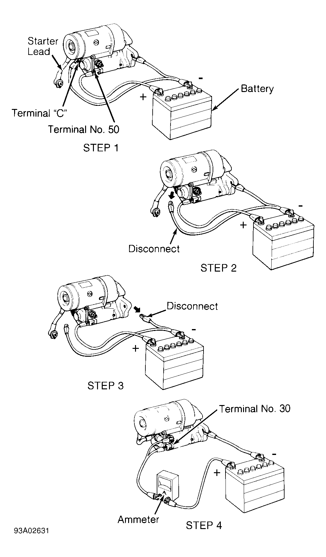 Connect battery and ammeter to starter. Refer to step No. 4 in illustration. See Figure. Starter armature should rotate smoothly and steadily. Amperage draw should be within specification. See NO-LOAD TEST SPECIFICATIONS  table.