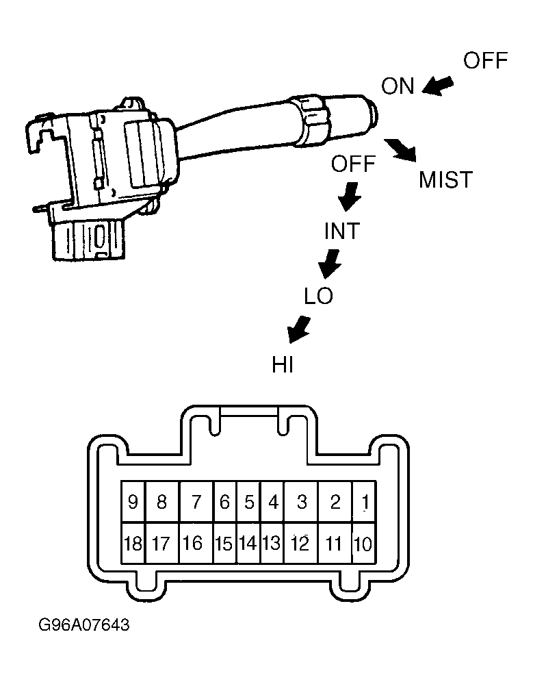 Disconnect combination switch connectors. Check for continuity between specified terminals. See Fig 1. See appropriate WIPER/WASHER SWITCH CONTINUITY table. If continuity is not as specified, replace combination switch.