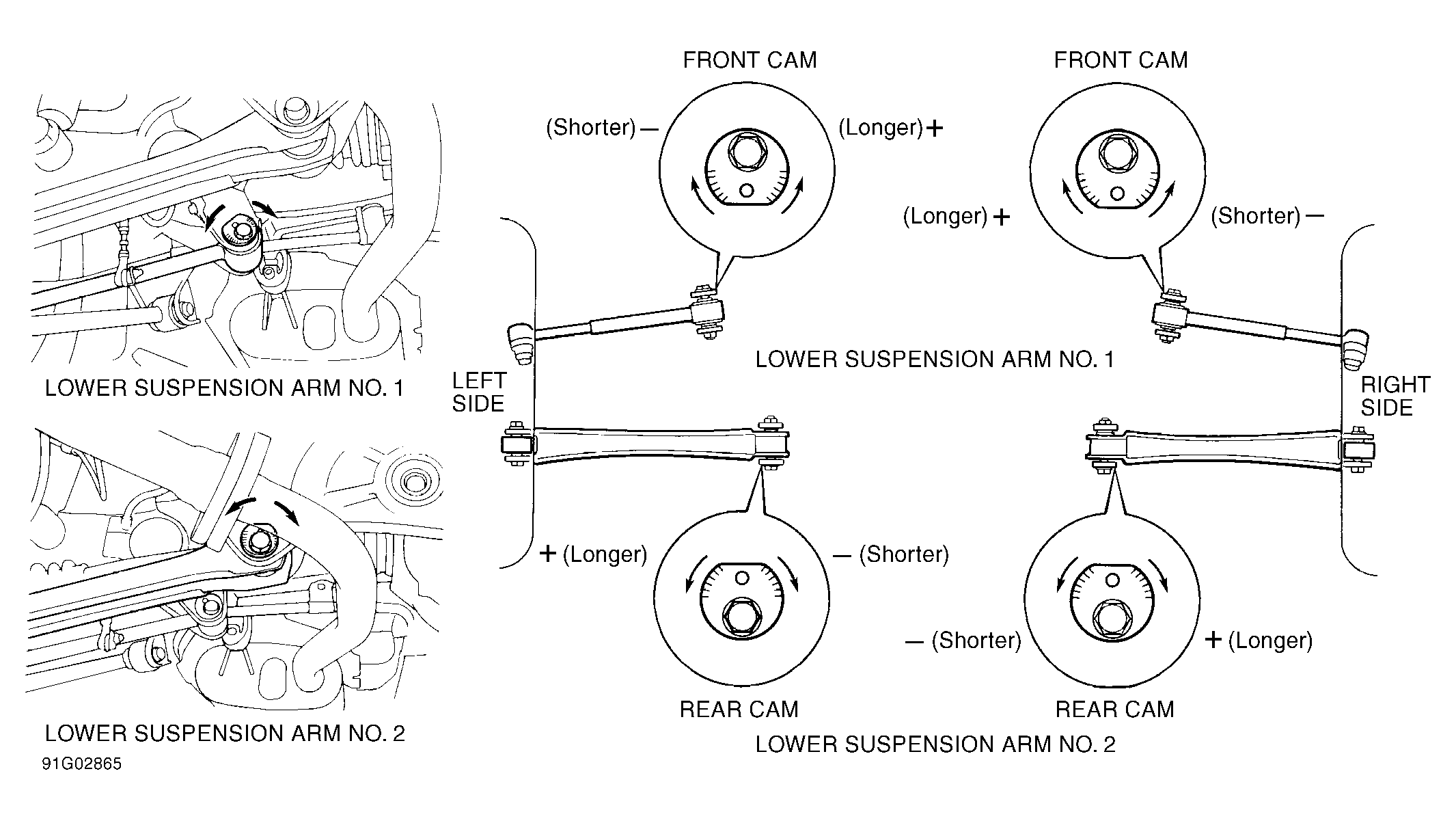 Ensure rear camber is correct. See CAMBER ADJUSTMENT  under WHEEL ALIGNMENT PROCEDURES. Bounce both ends of vehicle several times to settle suspension. Measure toe-in. See WHEEL ALIGNMENT SPECIFICATIONS . If toe-in is not within specification, loosen adjuster cam bolts. Adjust toe-in by turning adjuster cams. See Figure. Tighten adjuster cam bolts to specification. See TORQUE SPECIFICATIONS .