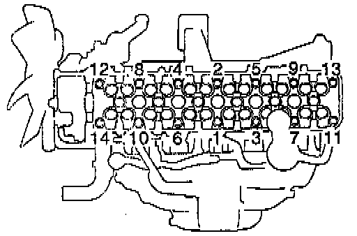 Install and uniformly tighten the 14 cylinder head bolts and plate washers, in several passes, in the sequence shown.