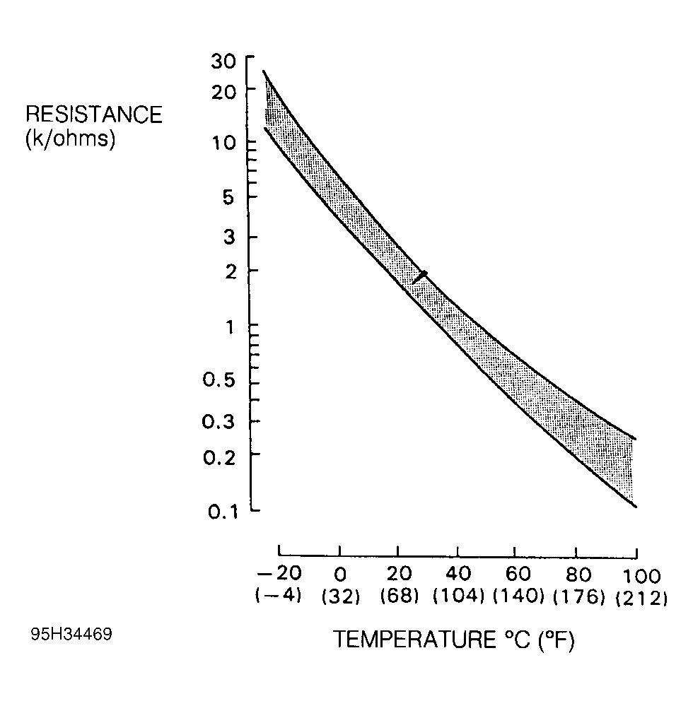 For engine coolant temperature sensor location, see information in SYSTEM/COMPONENT TESTS article. Using ohmmeter, check resistance between electrical terminals on engine coolant temperature sensor. Ensure resistance is within specification in relation to specified temperature. See Fig 1.