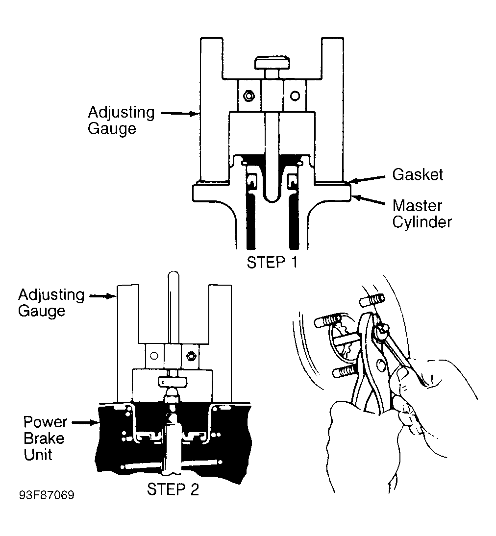 - Install Adjuster Gauge (09737-00010) onto master cylinder, with master cylinder gasket in place. Lower gauge pin until it just touches master cylinder piston. See Fig 1 (STEP 1). Invert gauge, then install onto brake booster. See Fig 1 (STEP 2).