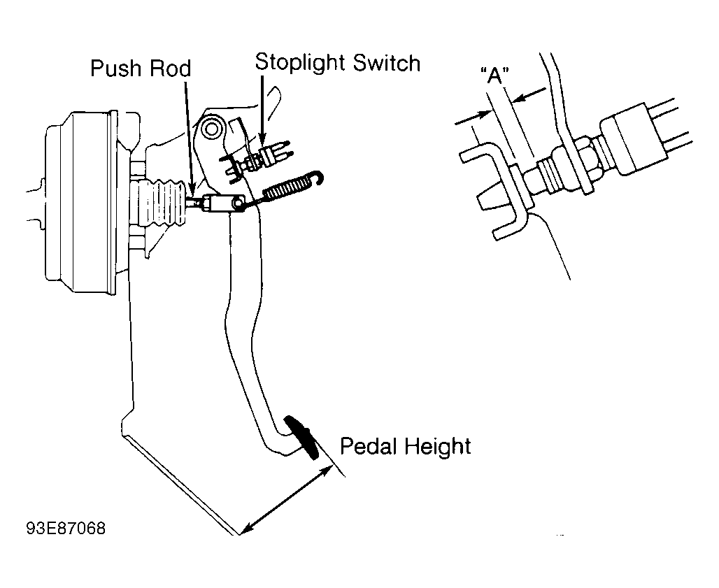 Remove lower instrument panel and air duct (if necessary). Loosen lock nut. Rotate switch until clearance between switch and pedal stop is 0.02-0.09" (0.5-2.3 mm). See Figure. Check brake pedal height. See BRAKE PEDAL HEIGHT under ADJUSTMENTS. Check brakelight operation.
