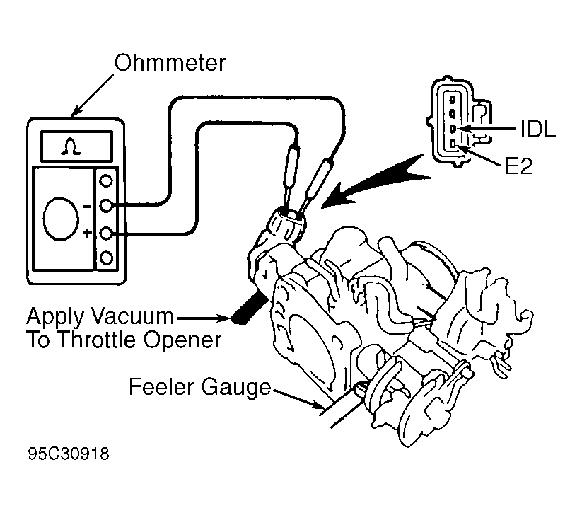 1. Disconnect electrical connector from Throttle Position (TP) sensor. Loosen TP sensor mounting screws. Connect ohmmeter between terminals IDL and E2. See Fig 1.