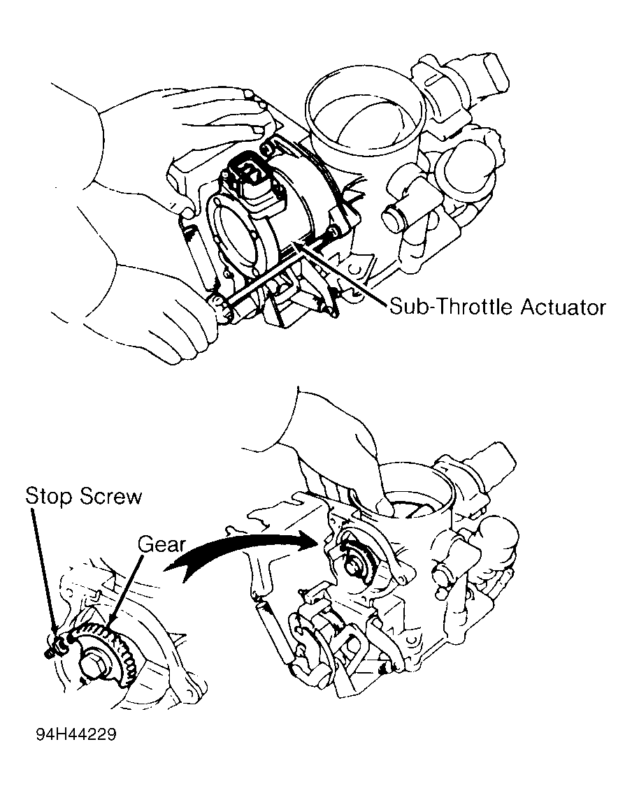 - Disconnect sub-TP sensor connector. Loosen sub-TP sensor mounting screws. Remove sub-throttle actuator. See Fig 1. Ensure sub-throttle valve is fully closed and sub-throttle valve gear is touching stop screw. Insert feeler gauge between gear and stop screw. See SUB-TP SENSOR ADJUSTMENT table.