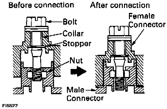 - Make sure the connector is completely connected, by tightening the bolt until there is a clearance of less than 1 mm (0.04 in.) between bottom of the male connector and end of the female connector.