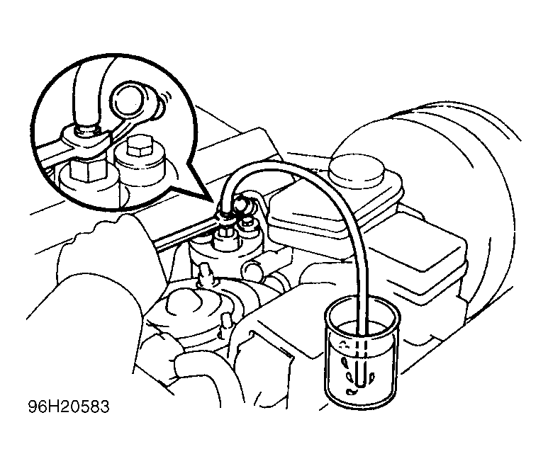 - Ensure master cylinder reservoir is full of brake fluid. Turn ignition off. Bleed TRAC control system by connecting a vinyl tube to accumulator bleeder screw. See Fig 1. Loosen bleeder screw. Start engine and allow TRAC pump motor to operate until all air has been bled from accumulator side. Tighten bleeder screw to 74 INCH lbs. (8.4 N.m) and turn engine off.