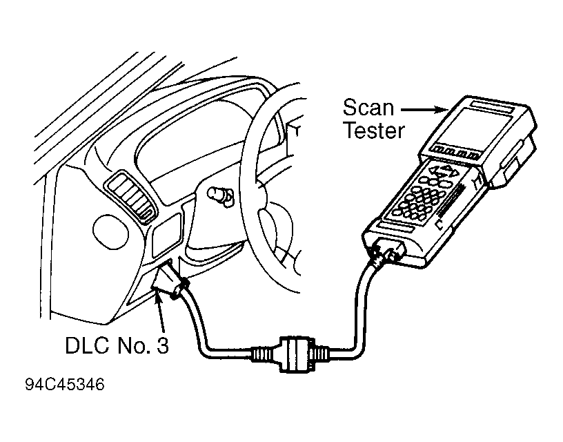 3. Install Fuel Pressure Gauge (SST 09268-45012), gaskets and banjo bolt. Tighten banjo bolt. Reconnect negative battery cable. Connect scan tester to Data Link Connector (DLC) No. 3. See Figure.