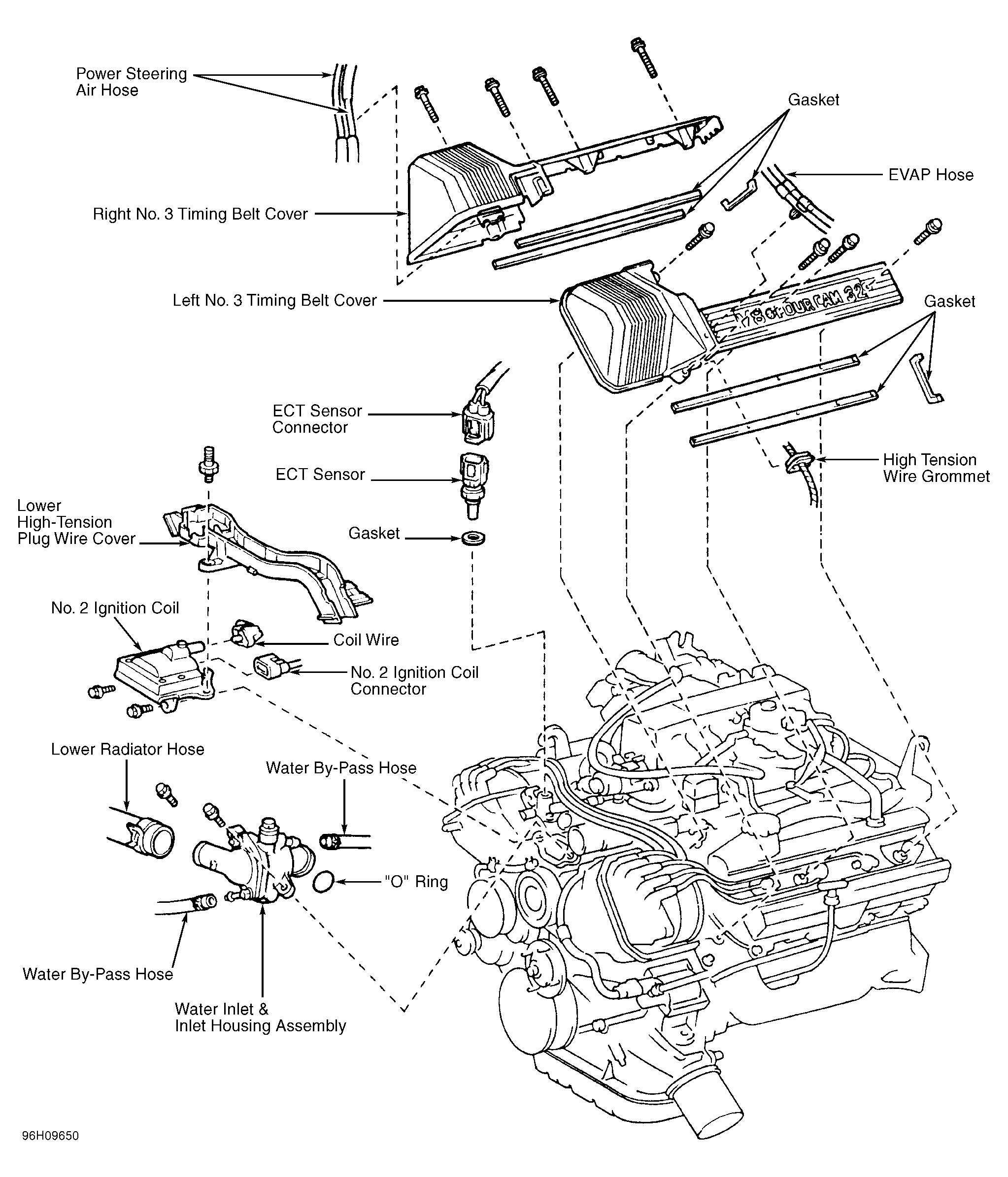 - Disconnect air duct hose from throttle body. Remove right and left engine wire covers. Remove right and left No. 3 timing belt covers (if necessary). See Figure. Remove high tension wire covers.
