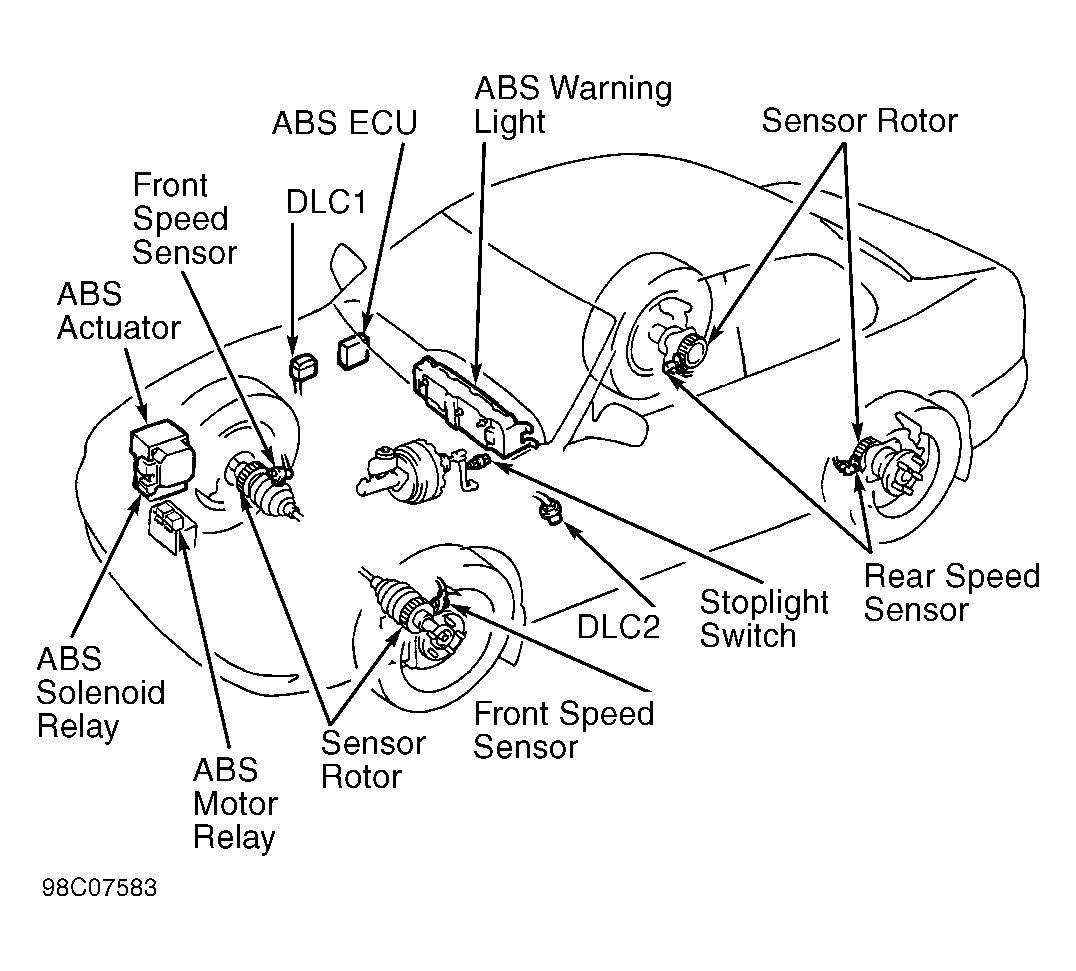 Anti-Lock Brake System (ABS) controls fluid pressures to each individual front brake caliper and rear brake calipers during a panic stop to prevent wheel lock-up. System consists of actuator, solenoid relay, pump motor relay, Electronic Control Unit (ECU), and a speed sensor at each wheel. See Fig 1. If a system fault occurs, the ECU stores a self-diagnostic code(s) that can be retrieved to diagnose malfunction.