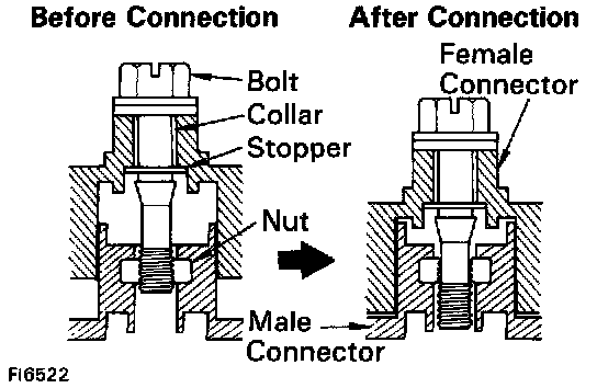- Make sure the connector is completely connected, by tightening the bolt until there is a clearance of less than 1 mm (0.04 in.) between bottom of the male connector and end of the female connector.
