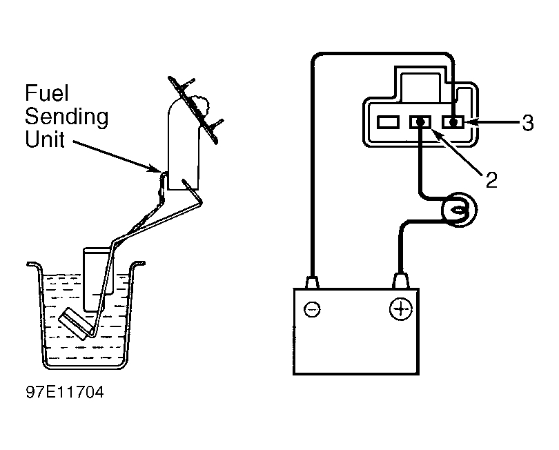 - Remove fuel gauge sending unit. Apply battery voltage between terminals No. 2 (+) and 3 (-) of fuel gauge sending unit connector (sending unit side of connector) with a 3.4-watt test light between battery positive terminal and sending unit connector. See Fig 1.