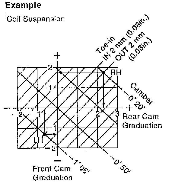 2. As shown the illustration, from the graph the amounts by which the front and/or rear cam are to be adjusted. Amount to turn adjusting cam (by graduation):