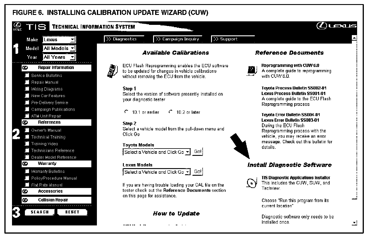 If the CUW does not launch, or the version is older than 6.0, install Diagnostic Software (TIS Diagnostic Applications Installer). Specific installation instructions (Reprogramming with CUW 6.0) are located under Diagnostics ECU Flash Reprogramming (Figure 6).