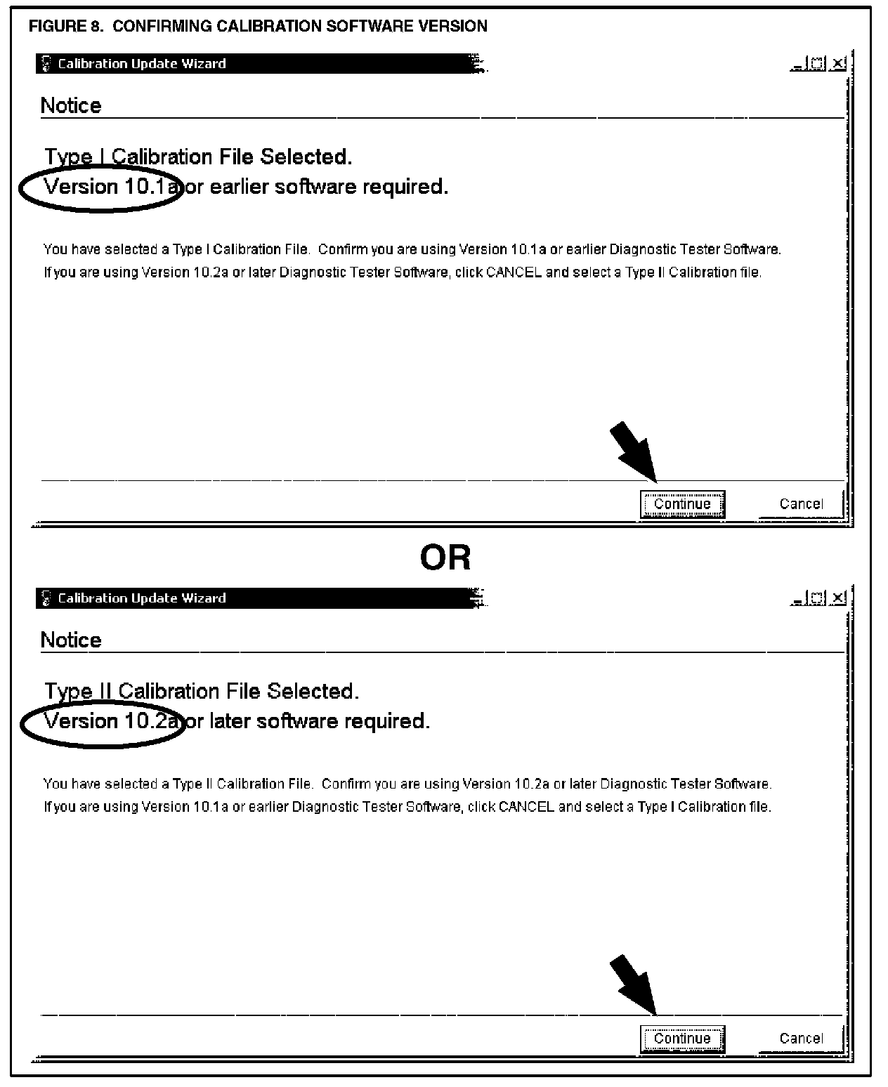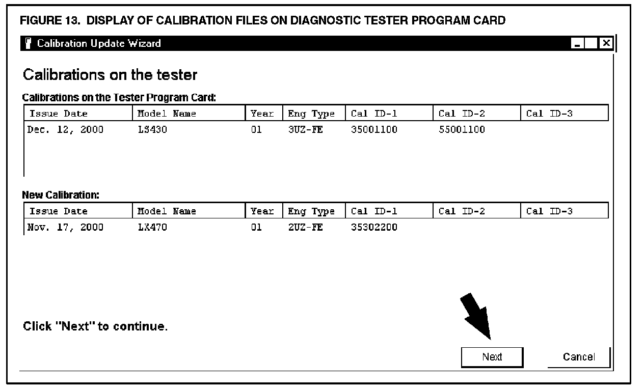 D. The Calibration Update Wizard (CUW) launches automatically when a calibration file link is selected (or clicked). Verify that the CUW version is 6.0 or higher. If not, refer to the Note below. The CUW will guide you through the steps to download the calibration file to the Diagnostic Tester Program Card. Click NEXT on the first screen (Figure 7).