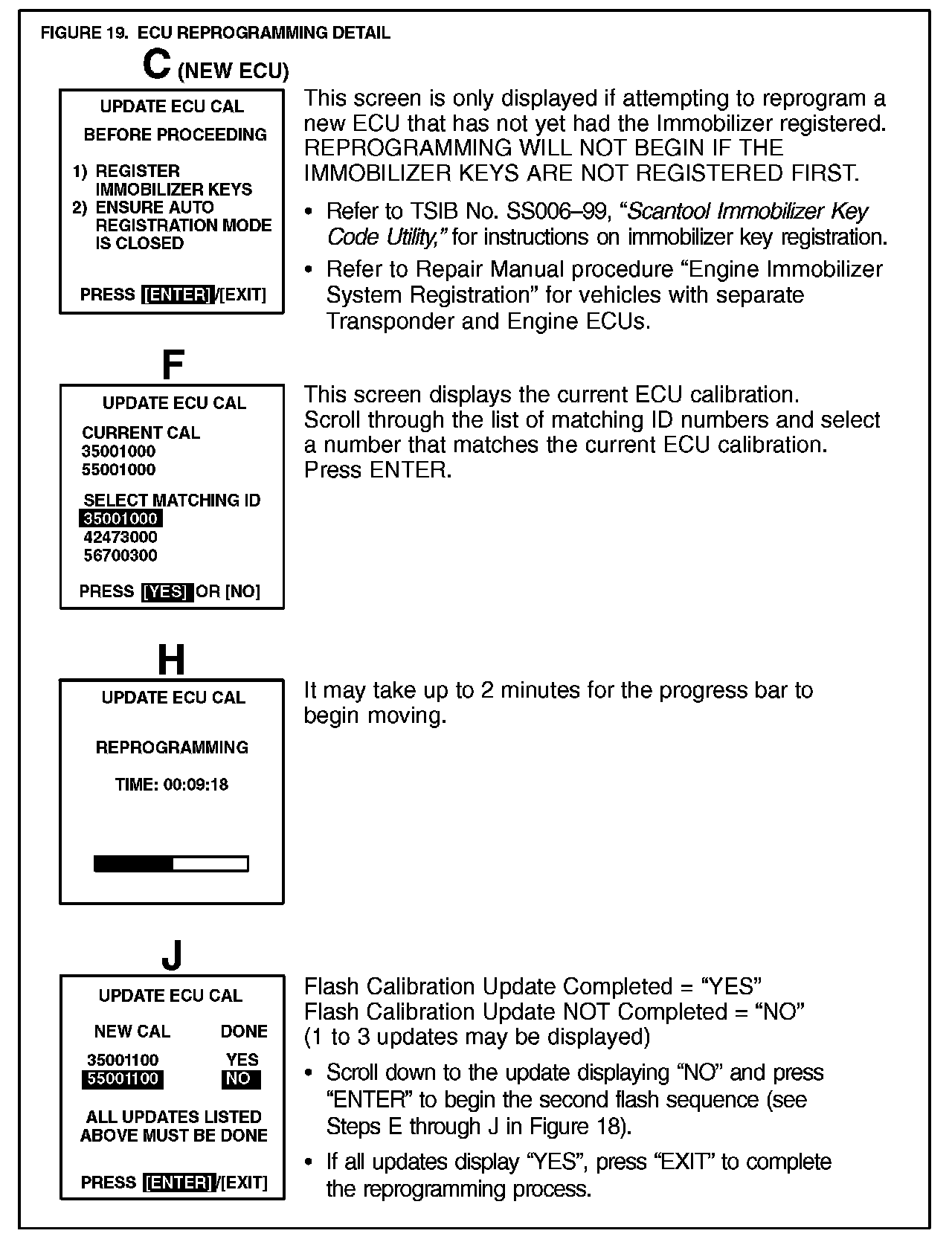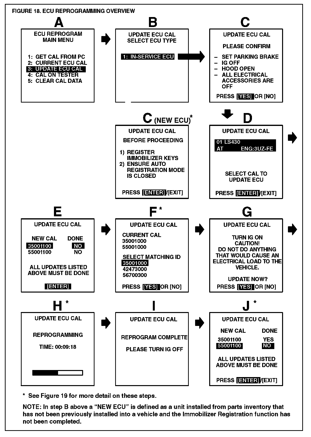 B. Continue to update the ECU calibration file following the screen flow (Figure 18). Details for selected screens are shown in Figure 19.