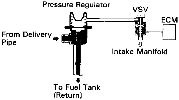 The ECM turns on a VSV (Vacuum Switching Valve) to draw the air into the diaphragm chamber of the pressure regulator if it detects that the temperature of the engine coolant is too high during engine starting.