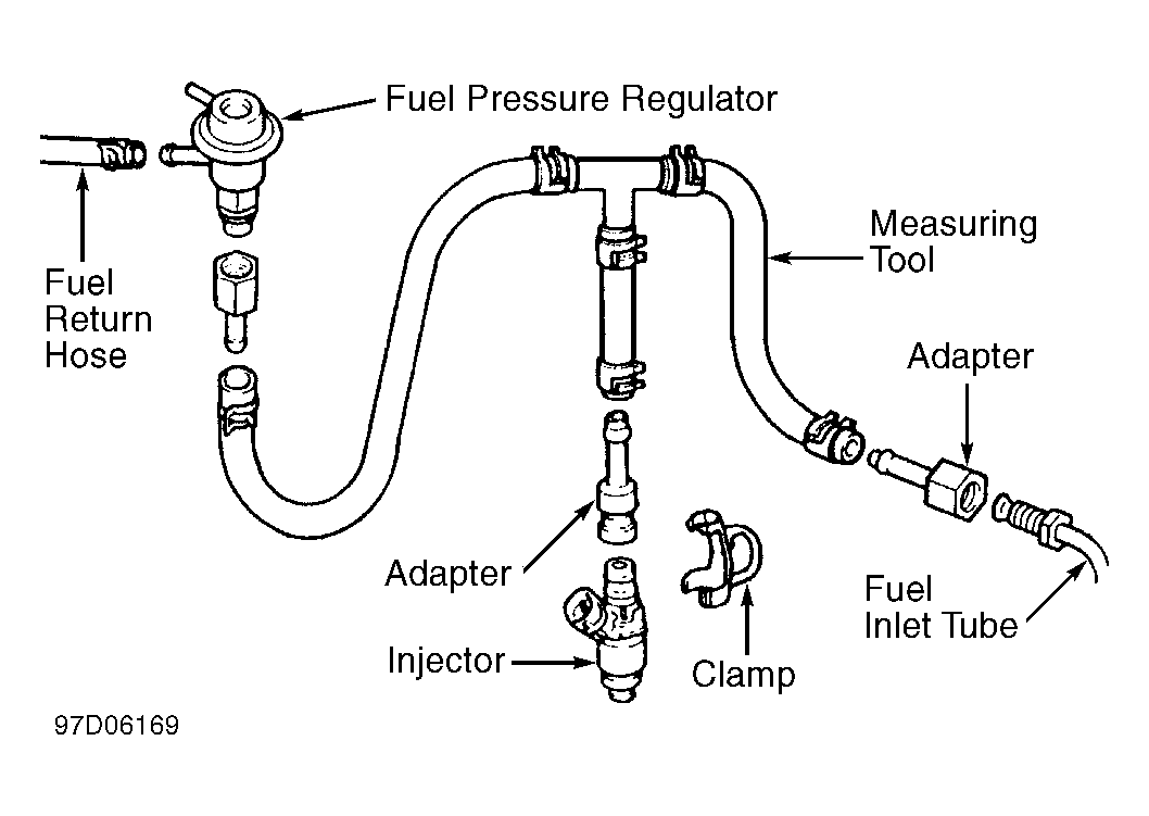 1. Remove fuel injector. See REMOVE/INSTALL/OVERHAUL article. Connect Injection Measuring Tool Set (9268-41046). See Fig 1. Attach a piece of vinyl tubing to bottom of fuel injector to prevent fuel splash. Put vinyl tubing into a graduated measuring cylinder.