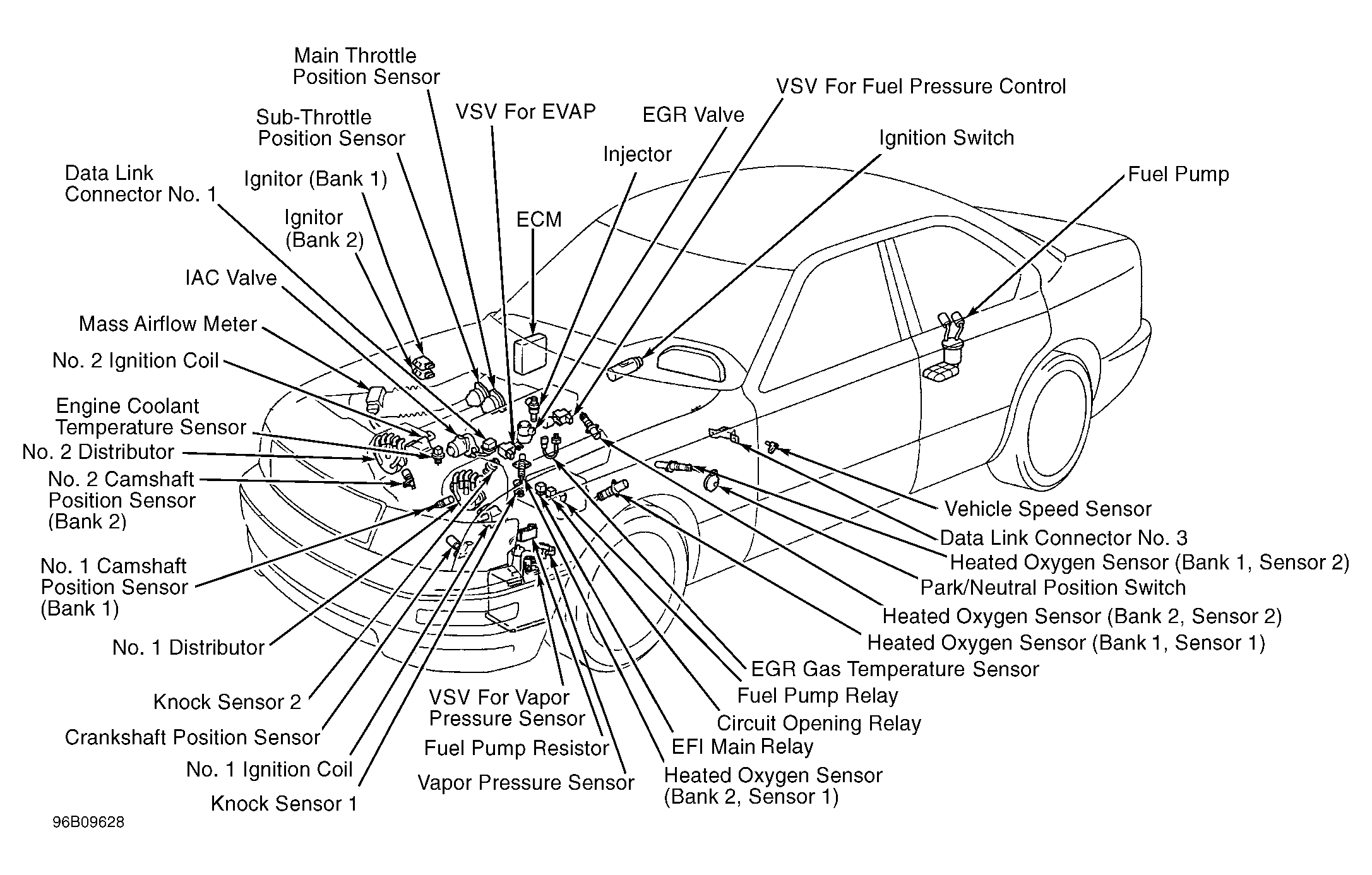 ECM controls engine operation based on input signals from various sensors. See Fig 1. ECM also controls transmission. If self-diagnostic system detects a fault, it stores a trouble code in the ECM memory, and turns on the Malfunction Indicator Light (MIL), also known as CHECK ENGINE light. For more information, see appropriate TESTS W/CODES article.