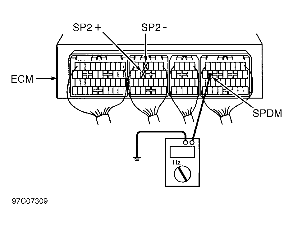 - Check VSS circuit resistance between terminal No. SP2+ and SP- of ECM. See Fig 1. Resistance should be 560-680 ohms. If resistance is okay, replace ECM. If resistance is not as specified, go to next step.