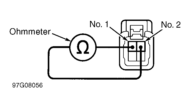 - Disconnect key unlock warning switch connector. Measure resistance between key unlock warning switch connector terminals No. 1 and No. 2. See Fig 1. Resistance should be more than 1 megaohm with key removed from ignition switch. Continuity should exist with key inserted in ignition. If resistance is as specified, go to next step. If resistance is not as specified, replace key unlock warning switch and retest system.
