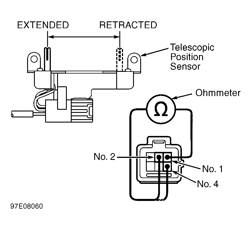 - Disconnect telescopic position sensor connector. Manually slide telescopic position sensor lever to fully extended position. Measure resistance between telescopic position sensor connector terminals No. 1 and No. 2. See Fig 1. If resistance is 3500-6500 ohms, go to next step. If resistance is not 3500-6500 ohms, replace telescopic position sensor and recheck system.