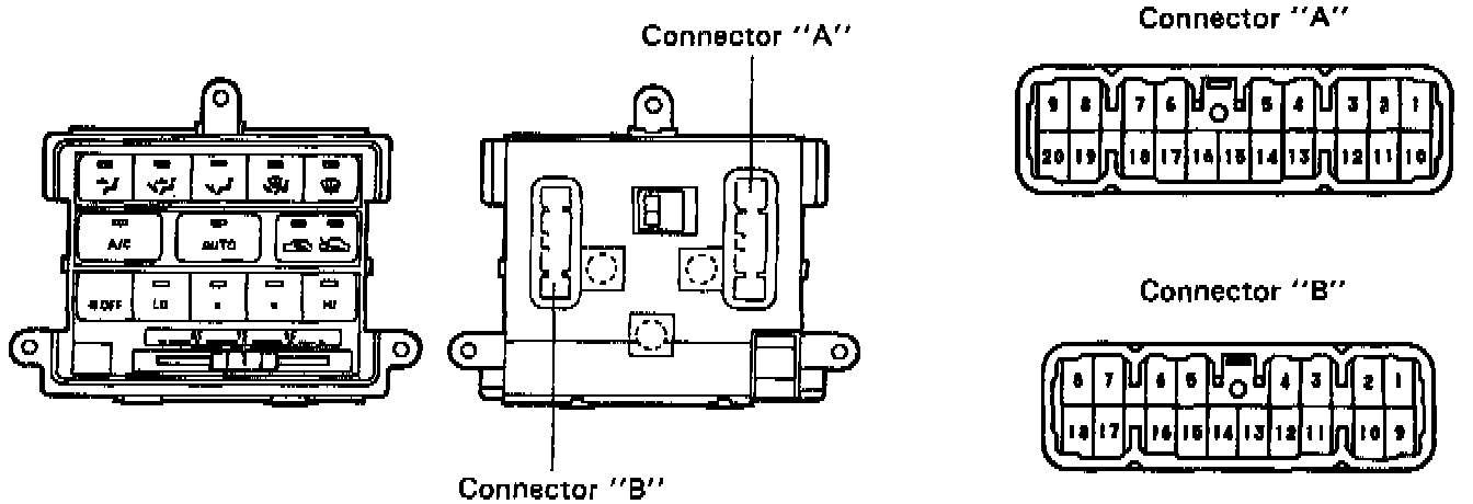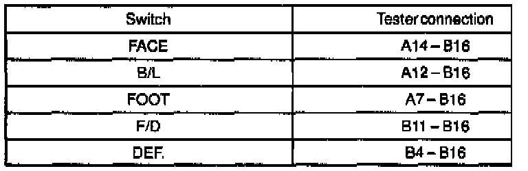 b. Gradually move the temperature control lever from "COOL" side to "HOT" side, and check that the resistance between terminals 13-3 and B-1 increase from 0 to approx. 3 K Ohms If switch operation is not as specified, replace the A/C control assembly.