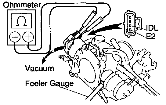 (d) Connect the test probe of an ohmmeter to the terminals IDL and E2 of the sensor.