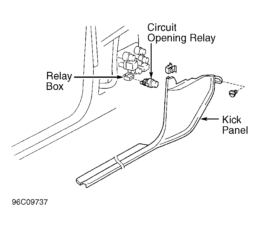 - Turn ignition off. Remove circuit opening relay from relay box behind driver's side kick panel. See Fig 1.