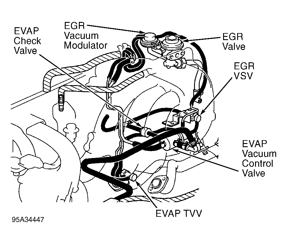 - Remove EVAP check valve from vacuum hose to EVAP Vacuum Control Valve (VCV). The EVAP VCV is located on bracket, below air intake chamber, near engine oil dipstick. See Figure.