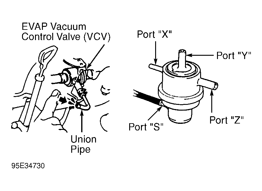 - Gradually increase engine to 3000 RPM. Ensure suction now exists on union pipe. If suction does not exist, remove EVAP VCV. Using vacuum pump, apply 2.8 in. Hg of vacuum to port "S" on EVAP VCV. See Fig 1.
