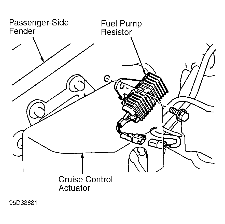 - Ensure ignition is off. Disconnect electrical connector at fuel pump resistor. Fuel pump resistor is located on passenger's side of engine compartment, near fenderwell and cruise control actuator. See Fig 1. Fuel pump resistor contains a Dark Gray 2-pin electrical connector.