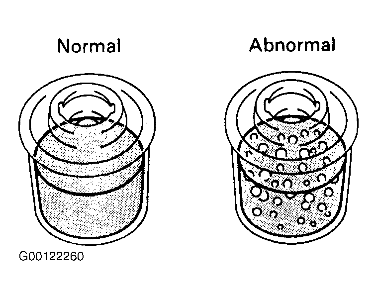 - Check for foaming or emulsification. See Figure. If there is foaming or emulsification, bleed power steering system.