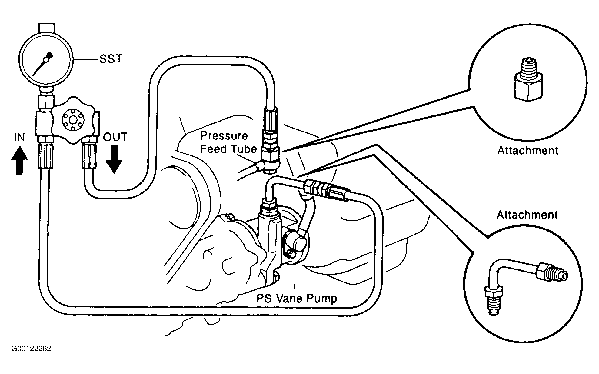 - Disconnect the pressure feed tube from the power steering vane pump.Connect SST. See Fig 1. Connect SST 09640-10010 (09641-01010, 09641-01030, 09641-01060) over 2 new gaskets.