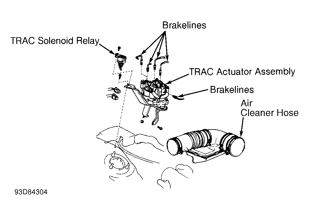 - Remove air cleaner, charcoal canister and ducting. Disconnect TRAC solenoid relay if necessary. Carefully disconnect brakelines from actuator. Remove bolts and actuator assembly. See Fig 1, Fig 2 or Fig 3
