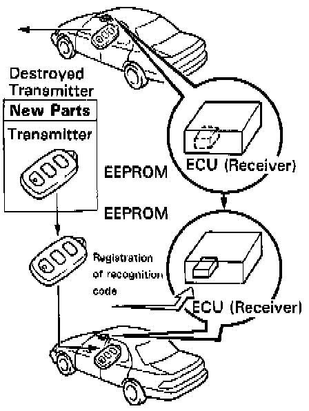 WIRELESS DOOR LOCK CONTROL ECU AND TRANSMITTER REPLACEMENTNote: Disassembly and assembly of the transmitter includes details of spare parts and replacement procedure for defective parts found through troubleshooting. Each part is a precision electronic component so handle with care.
