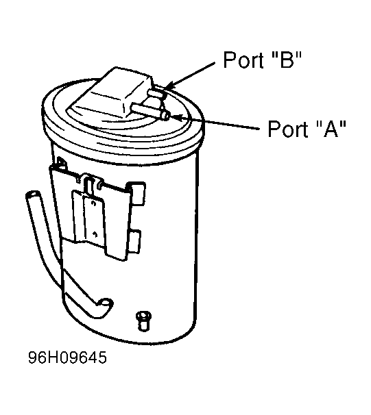 - Blow air into canister purge port "B" on top of canister. If air flows from any other port, replace canister. If air does not flow from any other port, hold finger over port "B". Blow a maximum of 43 psi (3 kg/cm2