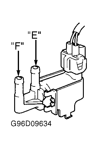 6. Using jumper wires, apply battery voltage to VSV terminals. Apply air pressure to VSV port "E". Air should flow from port "F". Remove jumper wires from VSV terminals. No air should pass through port "F". Replace VSV as necessary.