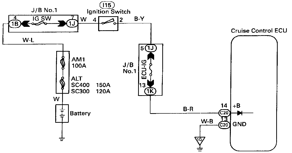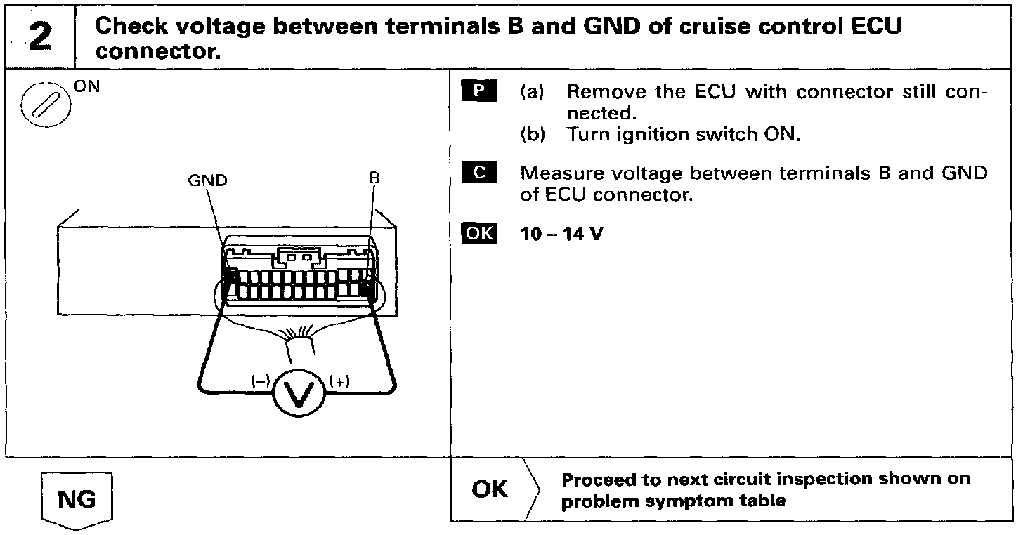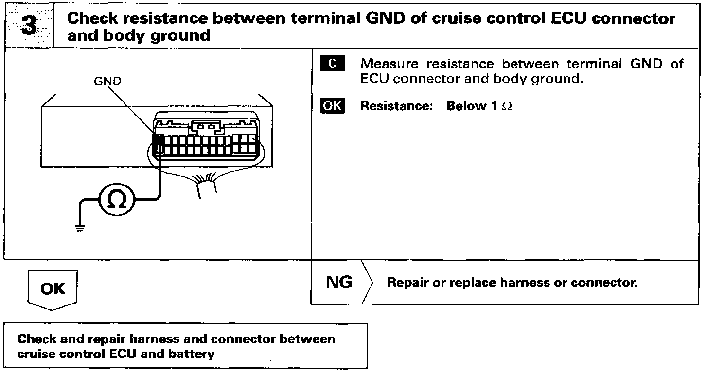 The ECU power source supplies power to the actuator and sensors, etc.. When terminal GND and the cruise control ECU case are grounded.