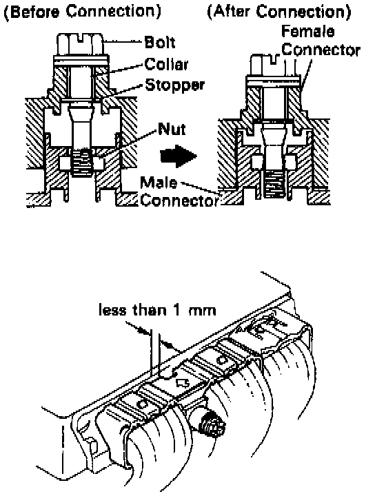 Make sure the connector is completely connected, by tightening the bolt until there is a clearance of less than 1 mm (0.04 in.) between bottom of the male connector and end of the female connector.