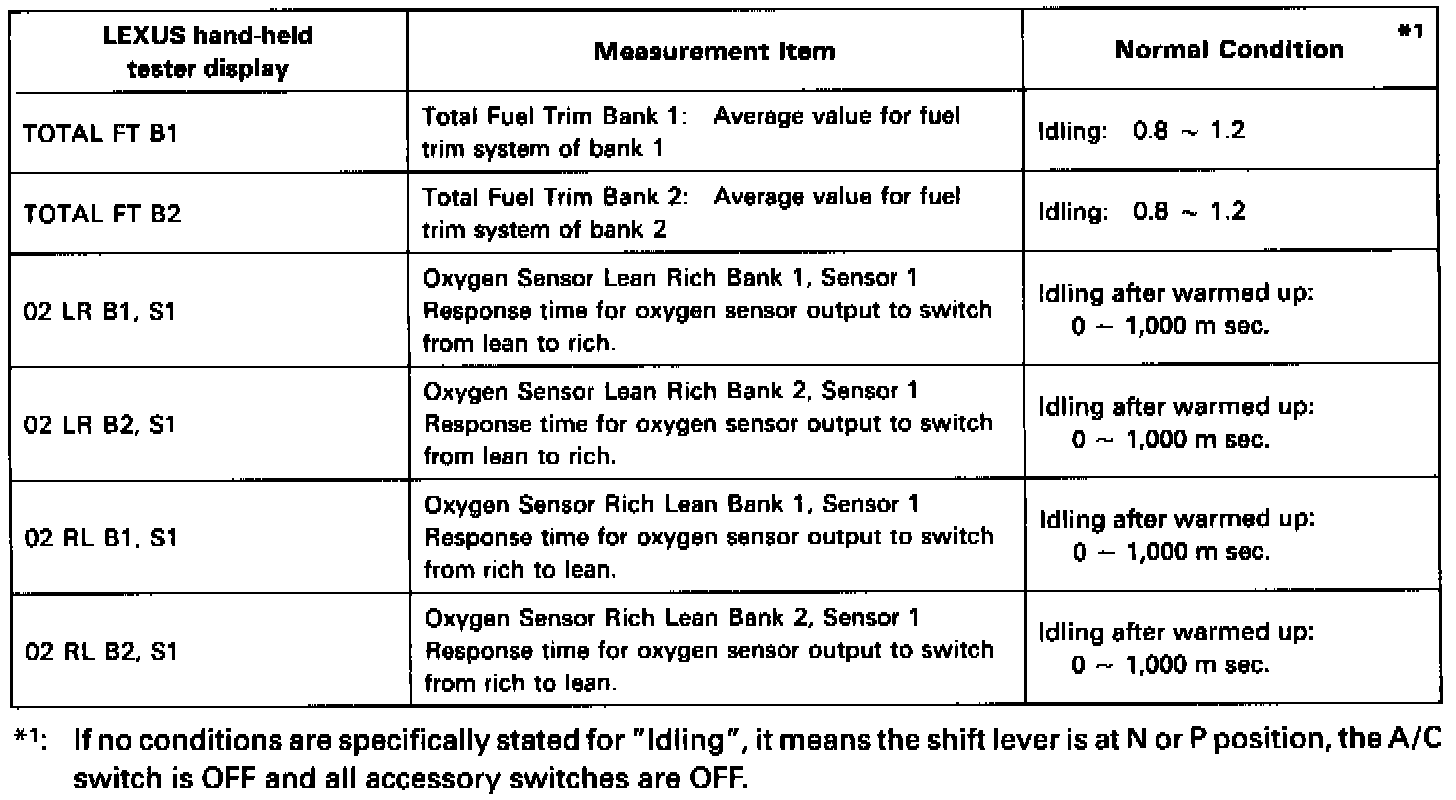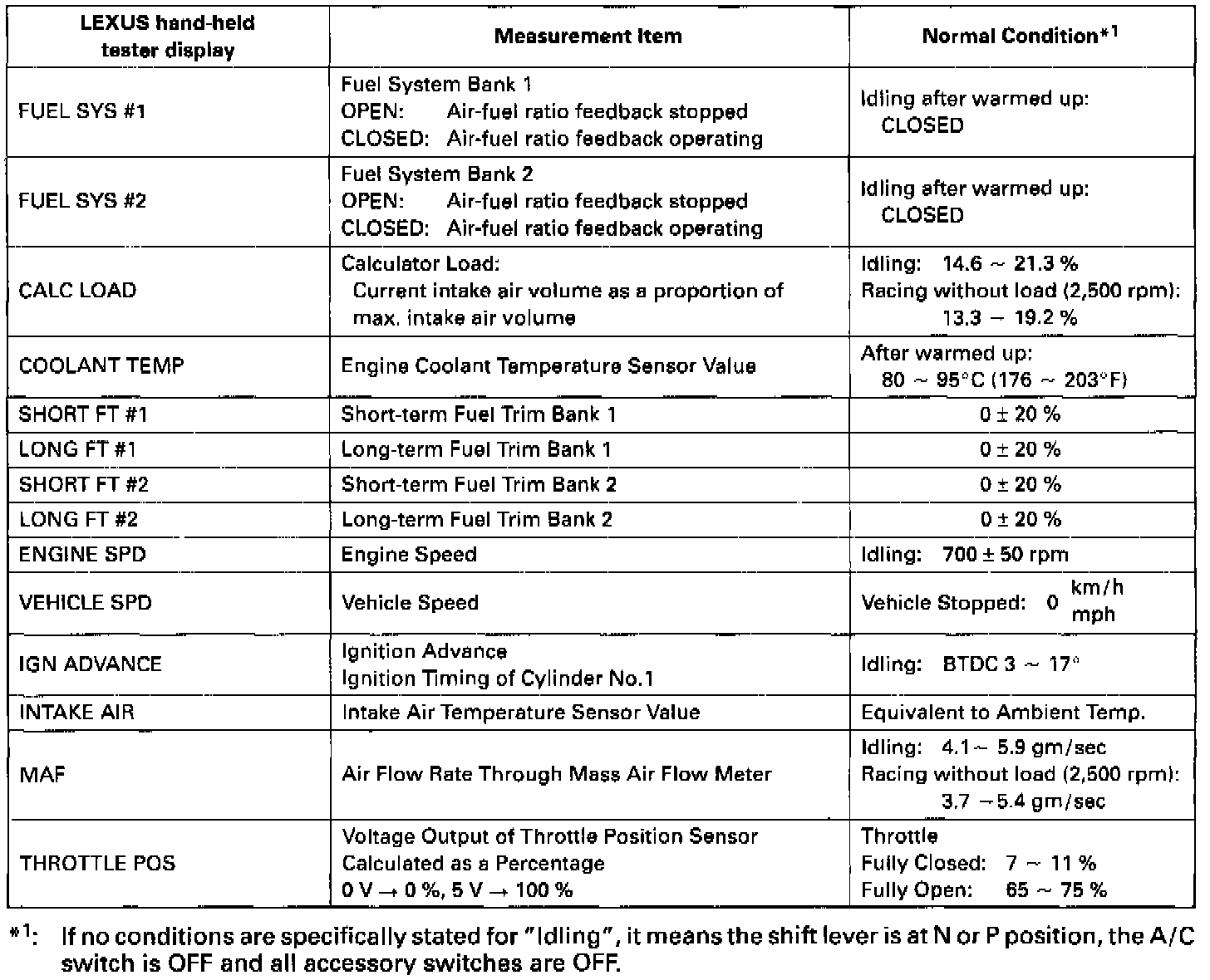 NOTICE: The values given below for "Normal Condition" are representative values, so a vehicle may still be normal even if its value varies from those listed here. So do not decide whether a part is faulty or not solely according to the "Normal Condition" here.