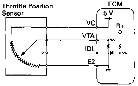 When the throttle valve is opened, the IDL contacts go off and thus the power source voltage of approximately 12 V in the ECM is applied to the terminal IDL of the ECM. The voltage applied to the terminal VTA of the ECM increases in proportion to the opening angle of the throttle valve and becomes approximately 3.5 - 5.0 V when the throttle valve is fully opened.