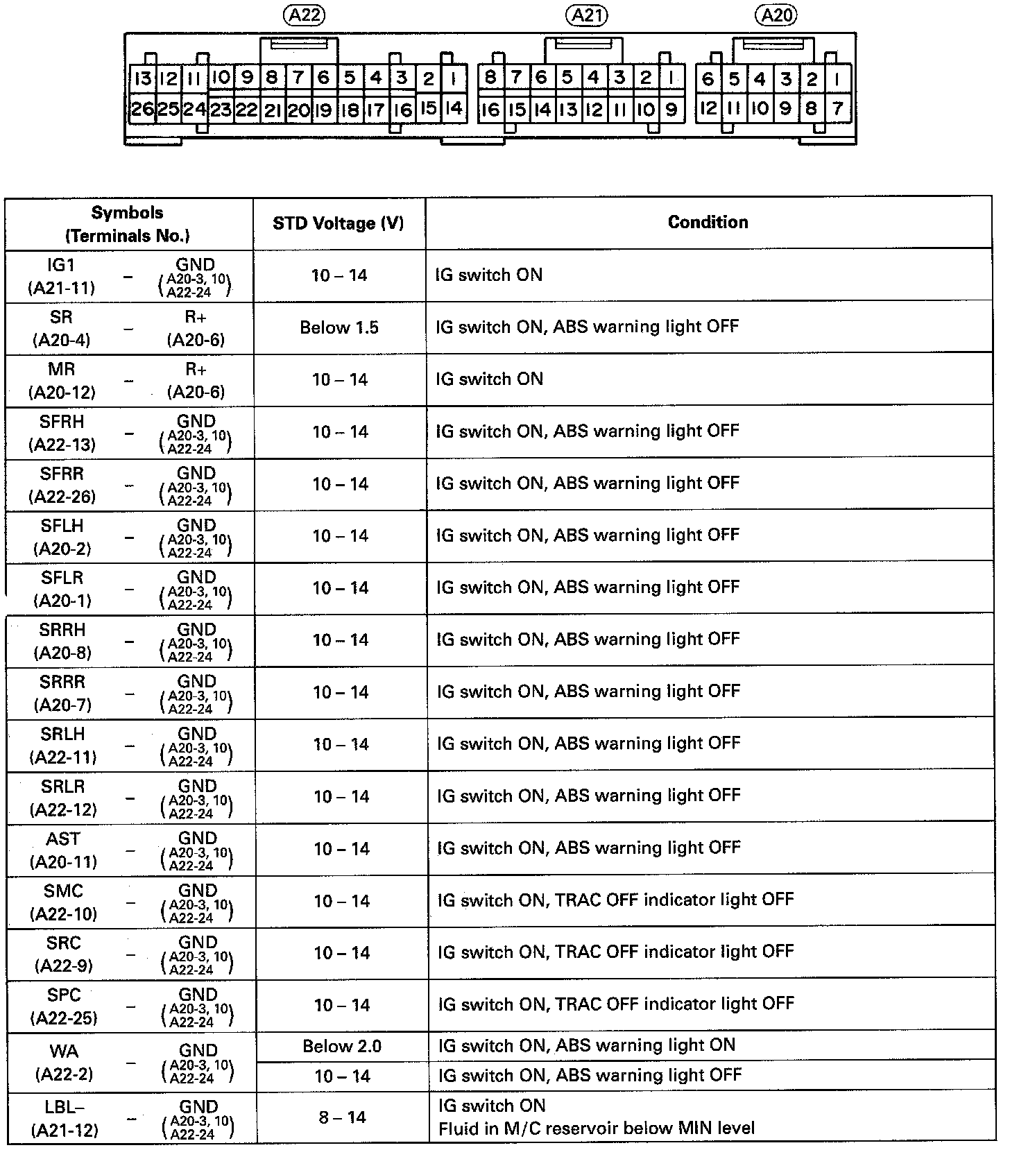 ABS w/ TRAC ECU Terminals And Standard Values Chart Part 1 Of 2: