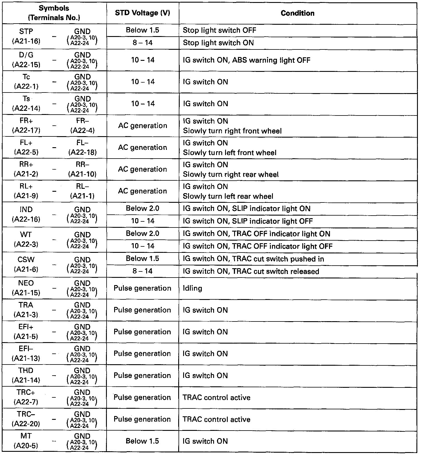 ABS w/ TRAC ECU Terminals And Standard Values Chart Part 2 Of 2: