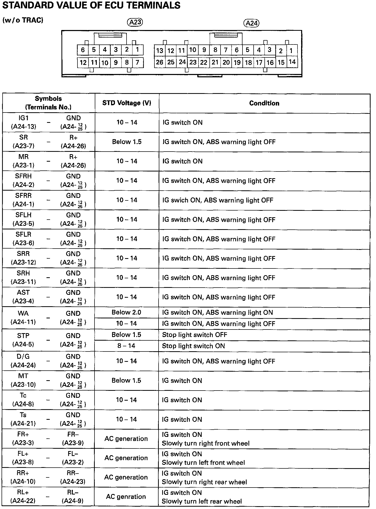 ABS W/out TRAC Standard Valve Of ECU Terminals Chart: